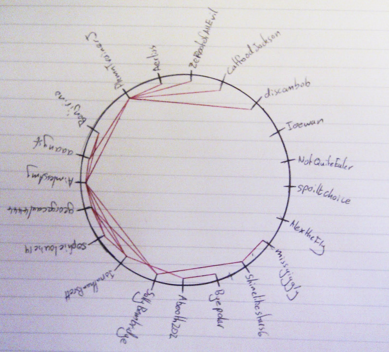 In case you were wondering, shinelikestars6 has a red circle on account of him being my nemesis. And he insisted upon it. The interactive version is here.