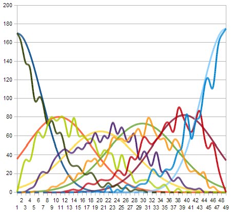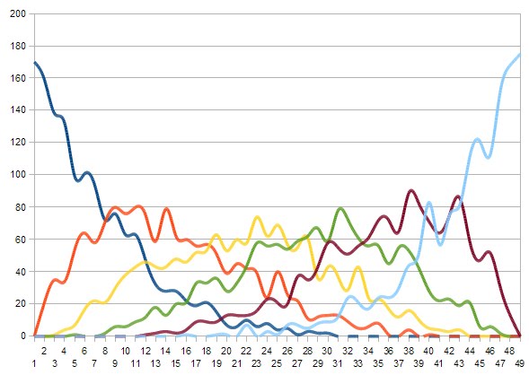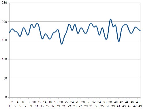 So you've got some obvious peaks and troughs there - the biggest peak being 38. So you'd think your best chance would be picking the six highest peaks, or lowest troughs if you subscribe to the "they're due to come up" theory.