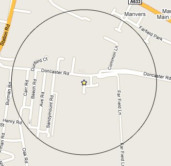 I looked up the population density of my area - South Yorkshire & Humberside = 340 people/km^2 - ran the numbers and got a radius of 452m. So on a map, that looks something like this