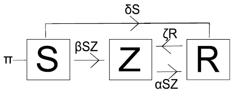 In the paper "WHEN ZOMBIES ATTACK!: MATHEMATICAL MODELLING OF AN OUTBREAK OF ZOMBIE INFECTION", mathematicians at Carleton University modified this model in various ways. In the simplest form, they replaced 'infective' with 'zombie' and allowed a certain proportion of the dead to be resurrected (as zombies).