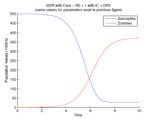 The next approach was to replace quarantining with 'cure' - assuming the cure didn't also provide immunity. The result of this model suggests that a state of stable co-existence between humans and zombies could be reached.