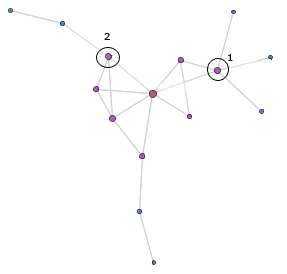 If node 1 RTs, then the tweet reaches an extra 3 people (10 people total). So in this case, 1 is more of a connector than 2.