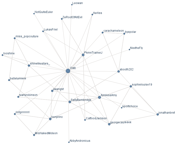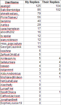 Now a problem arises here. Twoolr seems to be missing a significant number of people for the second column, who I know for a fact have @replied me during that period. I don't know what's going on there, and unfortunately there's not much I can do to help it.