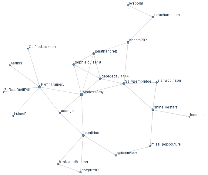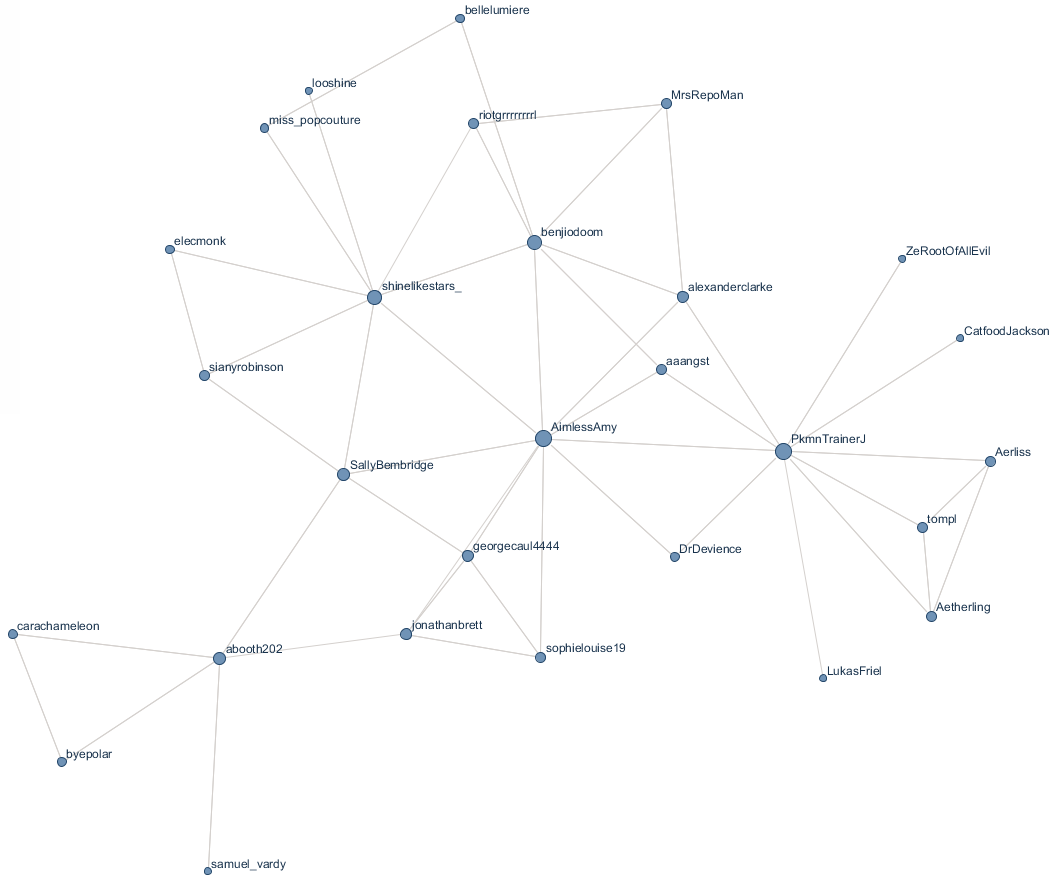 Working out PageRank was easier than the other two for one simple reason - I already had a lot of the data I needed, from previous network graphs. Obviously I had to update it first, and this is the graph as it stands (without me)