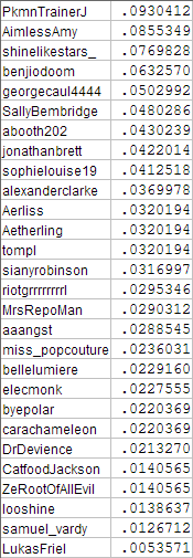 You have to bare in mind this particular PageRank calculation is only for my friend network, and assumes it's isolated from the rest of Twitter for simplicity. To get everyone's proper PageRank you'd have to analyse the whole of Twitter.