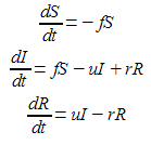 And there in lies the problem. As it turns out, this system will eventually reach a point where S is empty, and the sizes of I and R become constant (a stationary point). This happens when I = (r/u)R, and how fast it happens depends on f.