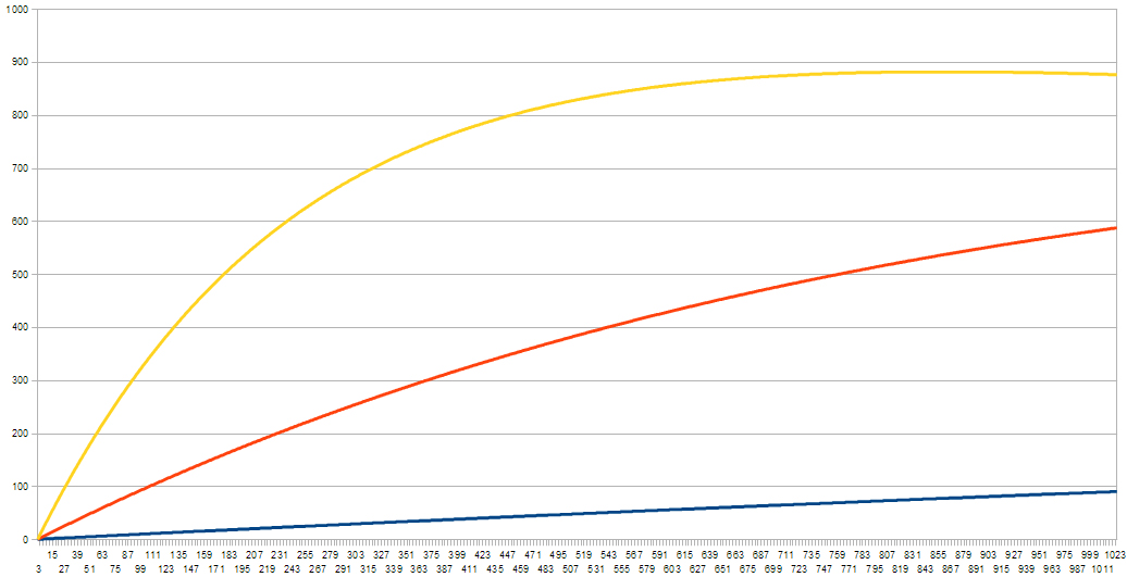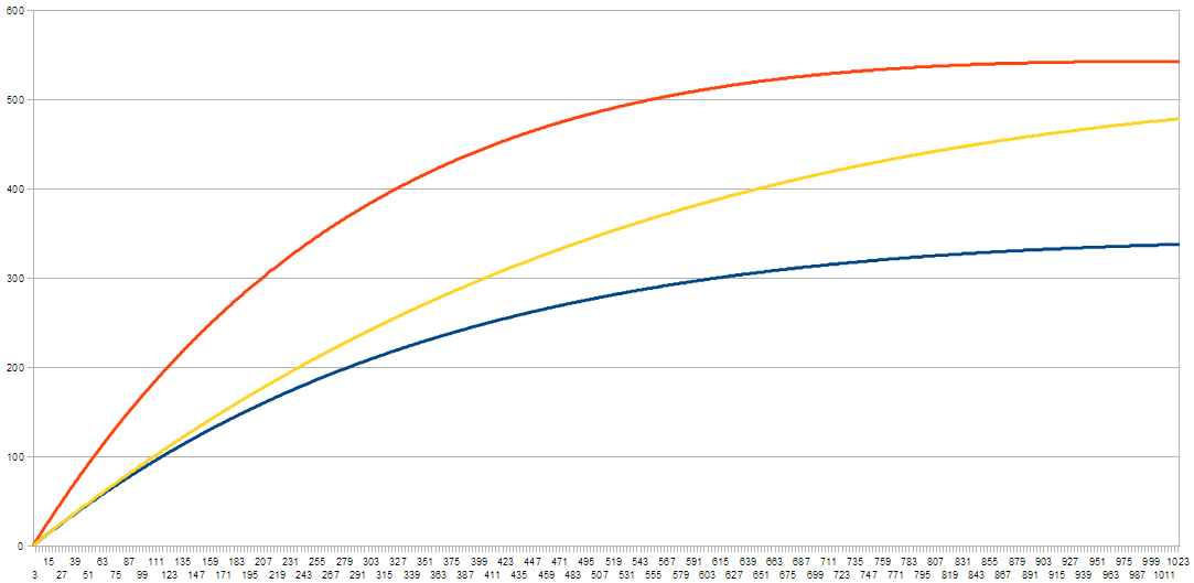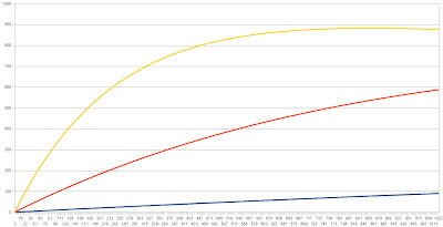 The blue one at the bottom is for a follow rate of 1 in 10,000, and it has a very steady increase. The top, yellow one has a rate 40 times higher, and has a much quicker increase. The orange one is somewhere in between.