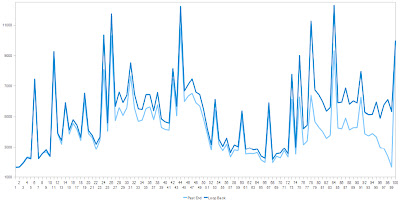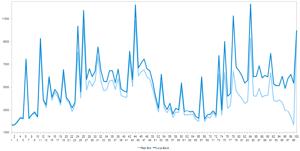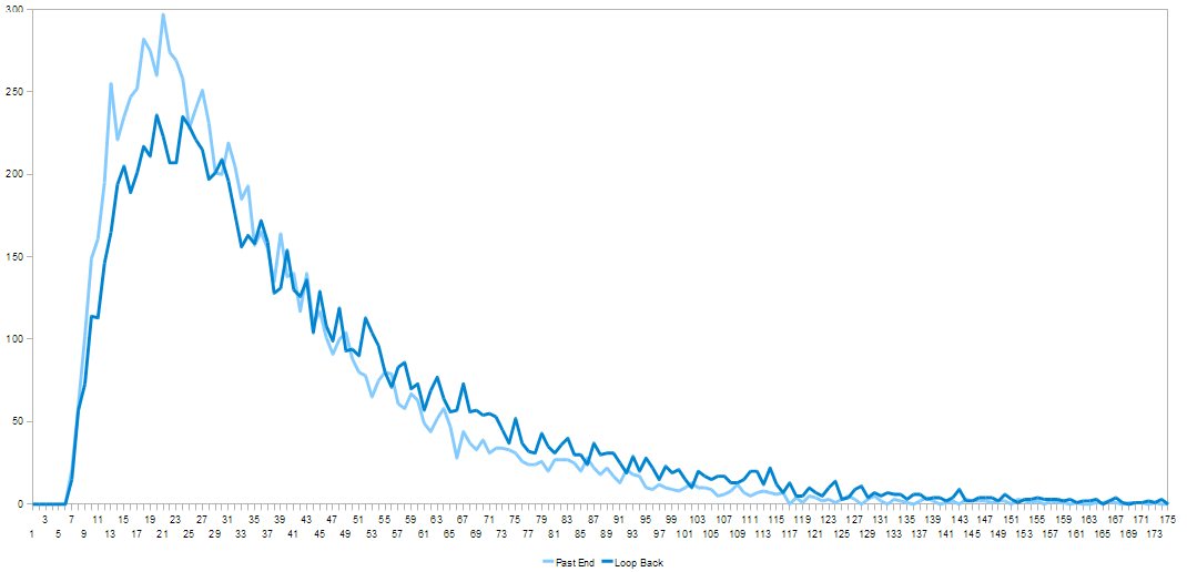 And that's demonstrated in the graph below - both lines are effectively the same until about the last 25 squares, where the 'loop back' diverges towards more visits (as expected).