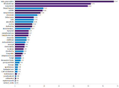 04 Feb 2011 So I first looked at this here, with a follow up here. The conclusion was that among the people I follow, the women do tweet more than the men.So it's now about 4 months since that last post, so I thought I'd have a quick look at how things have changed.