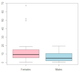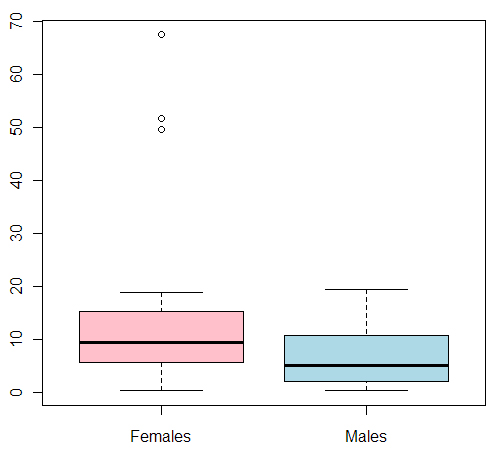 The three circles over the female's numbers are outliers. And once you factor out the outliers, you find the numbers are actually quite similar. But the middle quartiles (the box parts) are still slightly lower for the males.