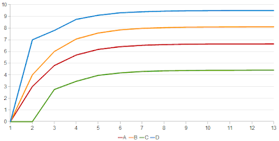 In this case, multiplying A by two brings everyone else's stable points up. It's also worth noting that A' stable point isn't just doubled, but multiplied by 2.7. This is a good example of the feedback effect mentioned at the start of the previous blog - increasing A' rate increases everyone else's rates, increases A' rate.