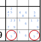 But look on that bottom row - the circled boxes can only take the values 3 or 5. What this means is that 3 and 5 can't go in any other of the squares in that box. So we eliminate 3s and 5s from the other squares in that box. Similarly for the 1/6 squares in the middle.