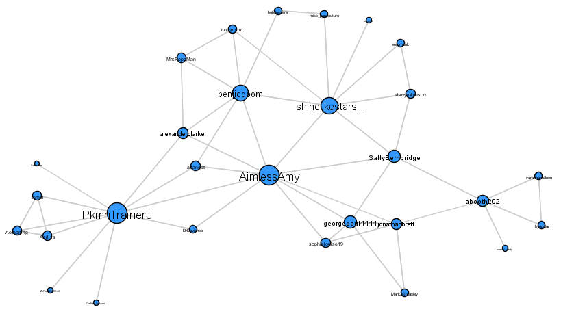 In case you were wondering, PkmnTrainerJ and SallyBembridge are most connected, both with degree 14. shinelikestars_ is next most, with degree 10.