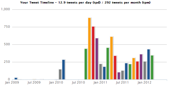This is another one I used to go to Twoolr for. And, to be fair, I still could. But that only goes as far back as April '10, and its graphics aren't as clear. Here's TweetStats again